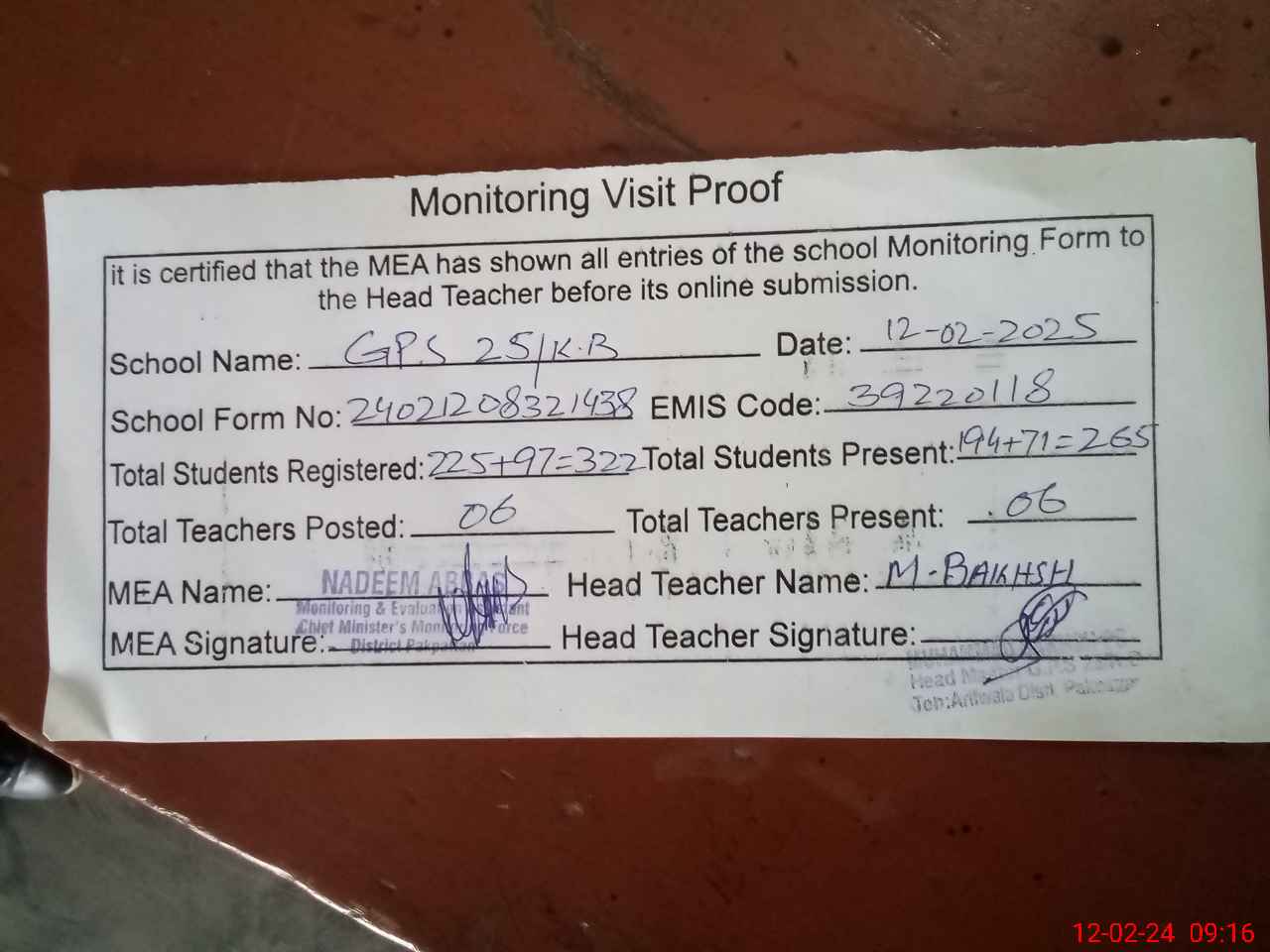 | Attendance Register | Head Teacher | MEA with School | Visit Proof |