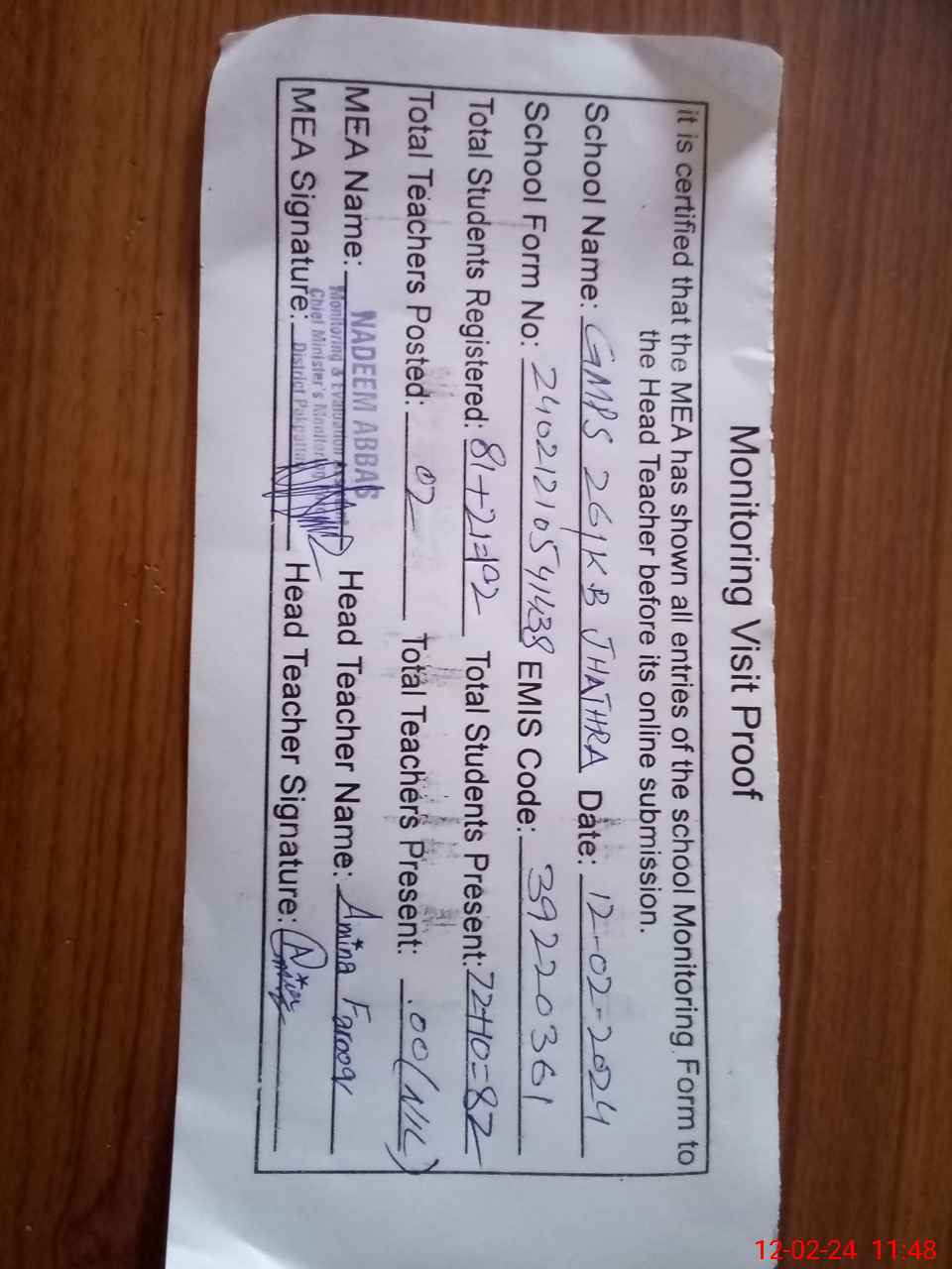| EMIS Code: 39220361 | Name of School: GMPS 26 KB JHAJHRA | |||