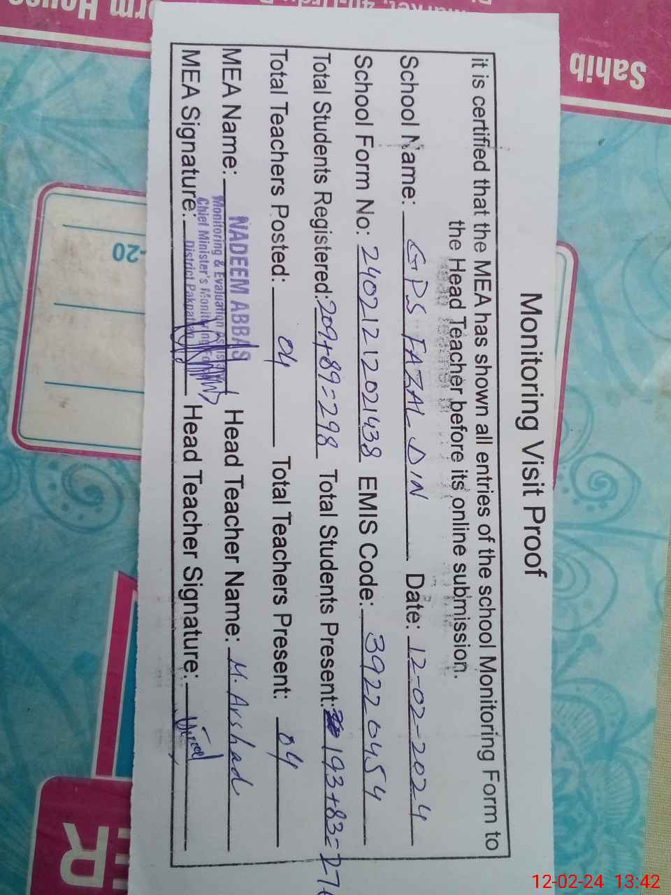 | EMIS Code: 39220454 | Name of School: GPS FAZAL DIN | |||