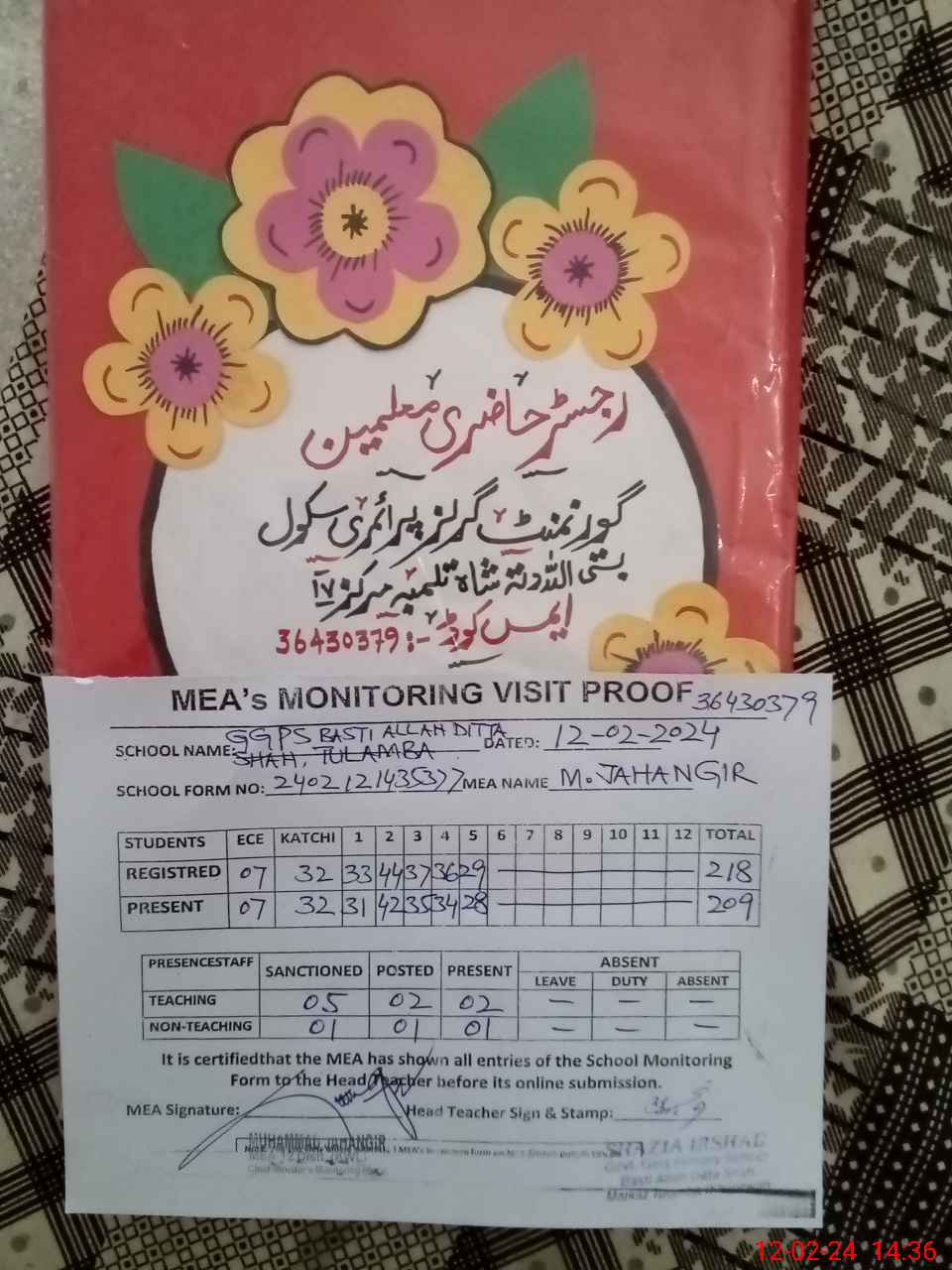 | Attendance Register | Head Teacher | MEA with School | Visit Proof |
