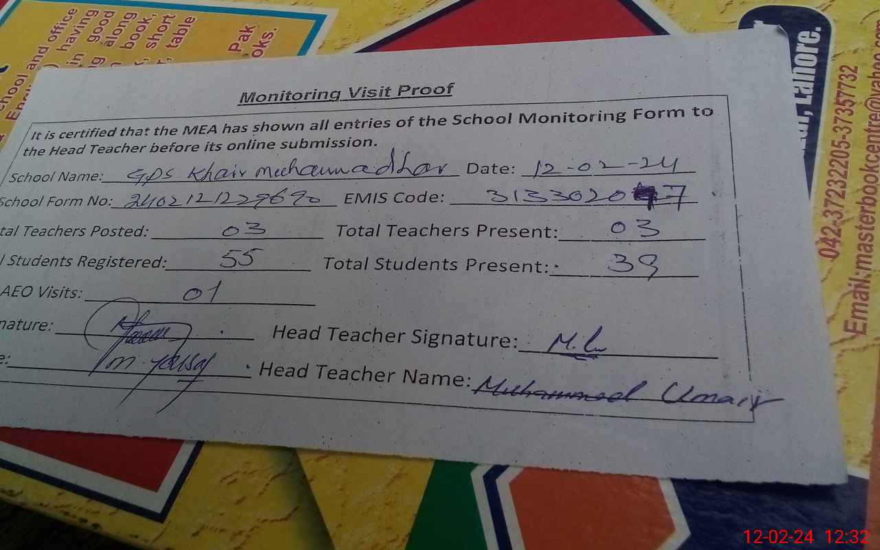 | Attendance Register | Head Teacher | MEA with School | Visit Proof |