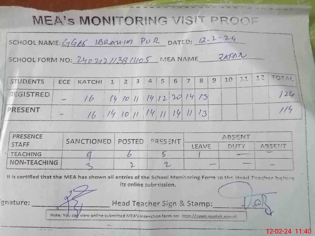 | Attendance Register | Head Teacher | MEA with School | Visit Proof |