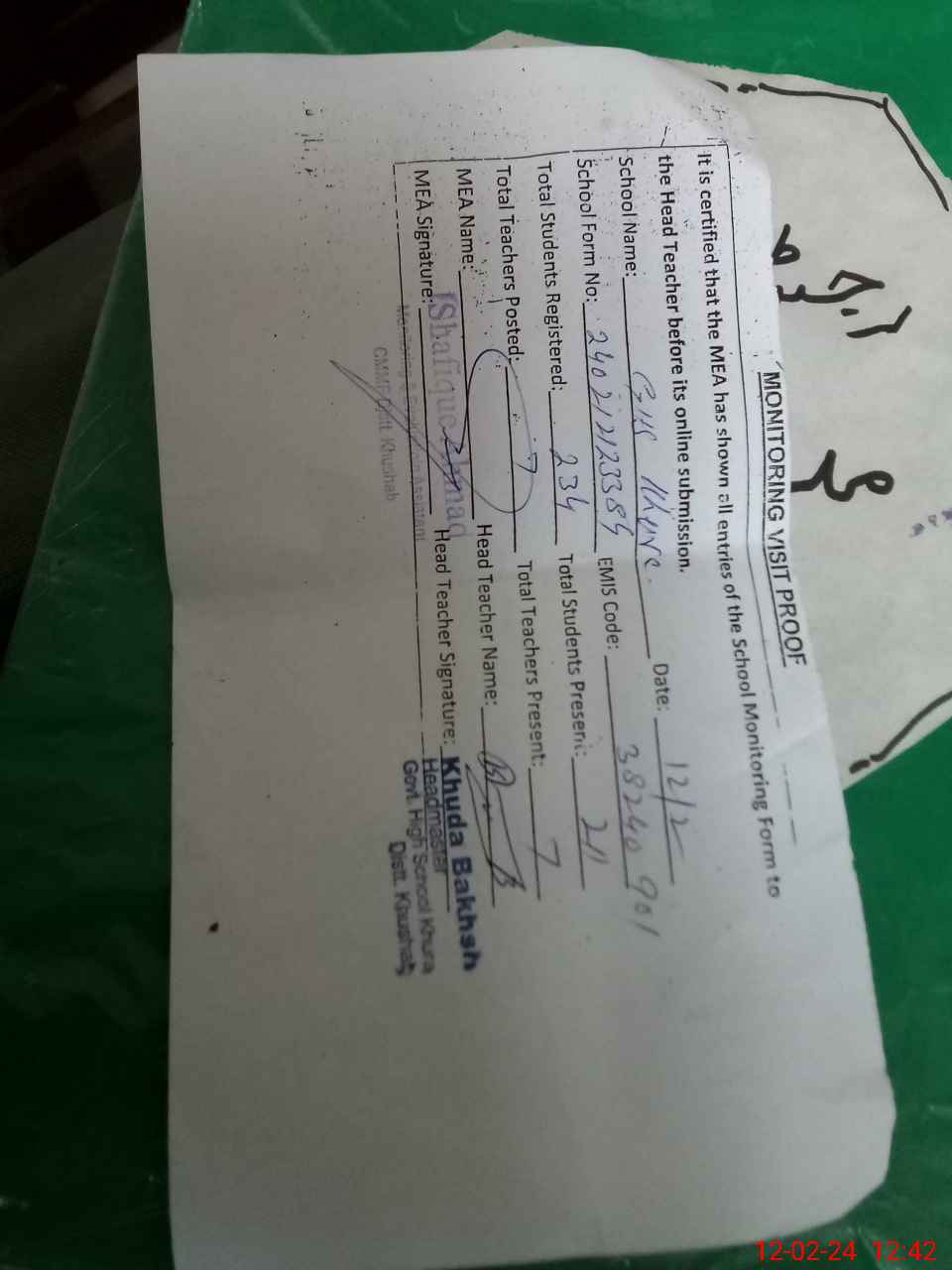 | Attendance Register | Head Teacher | MEA with School | Visit Proof |