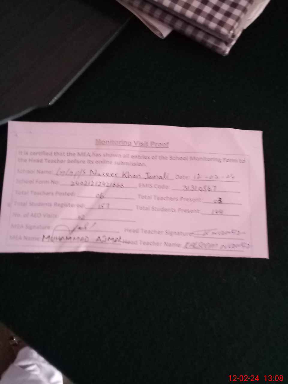 | Attendance Register | Head Teacher | MEA with School | Visit Proof |