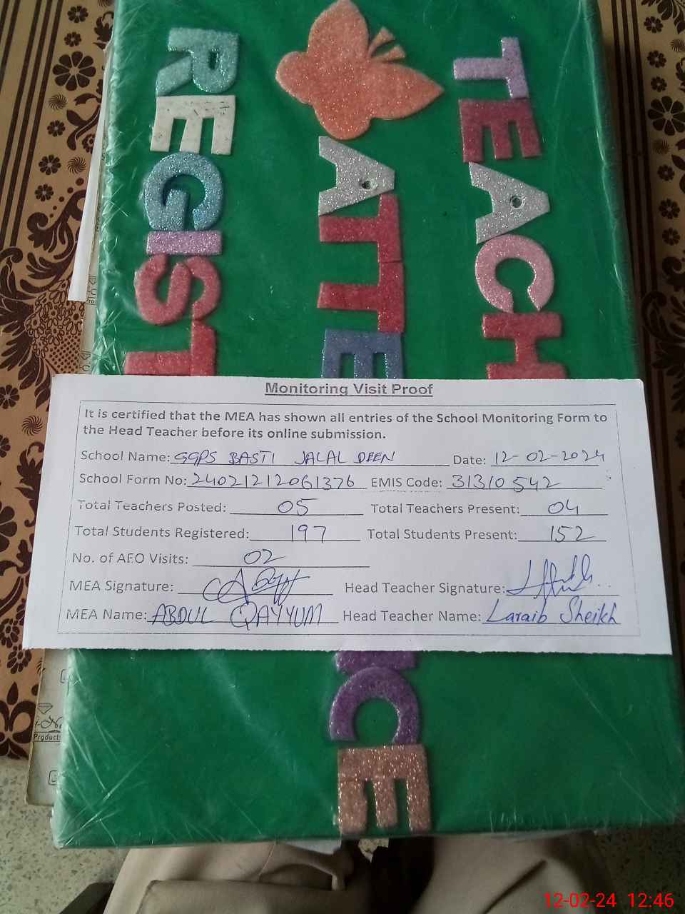 | Attendance Register | Head Teacher | MEA with School | Visit Proof |