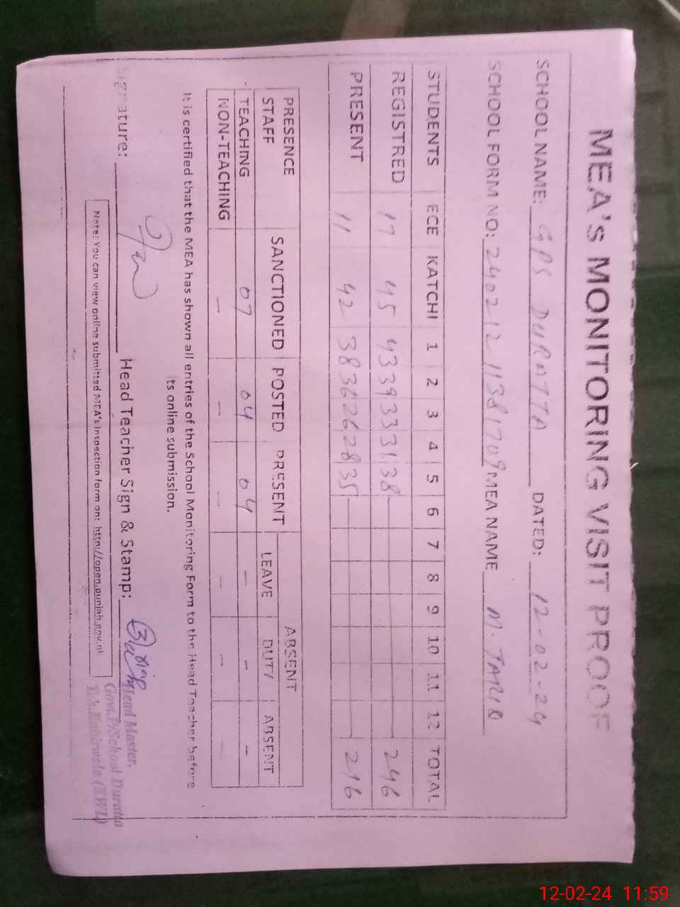 | Attendance Register | Head Teacher | MEA with School | Visit Proof |