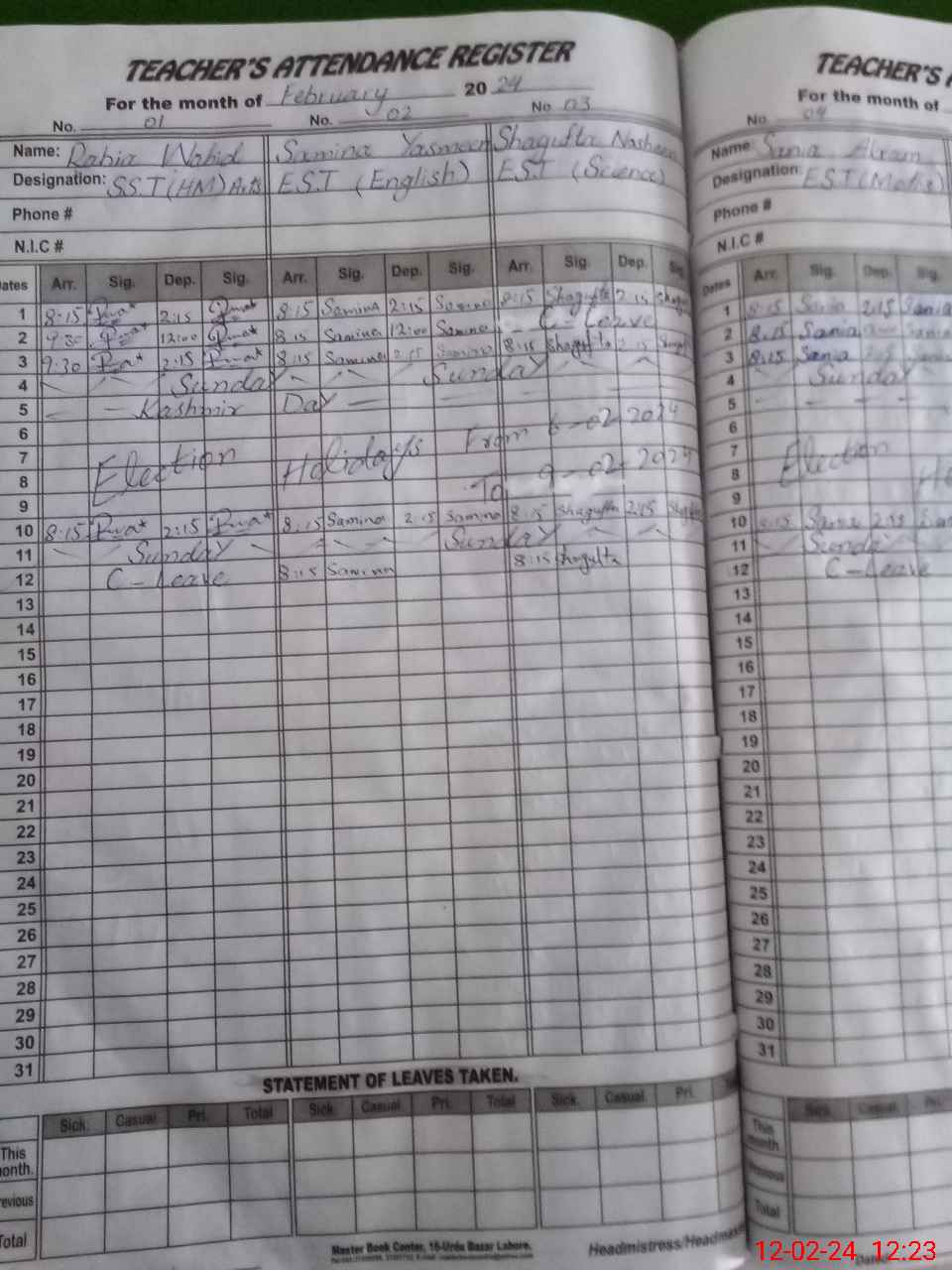 | CNIC | Full Name | Designation | R/C | Absence During Last Calender Month |