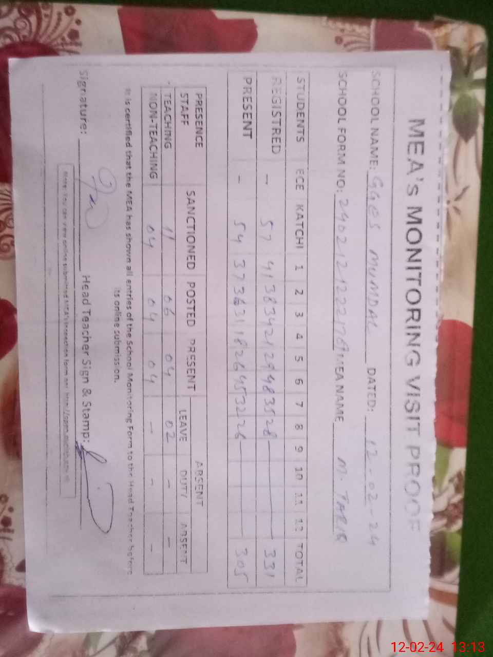 | Attendance Register | Head Teacher | MEA with School | Visit Proof |