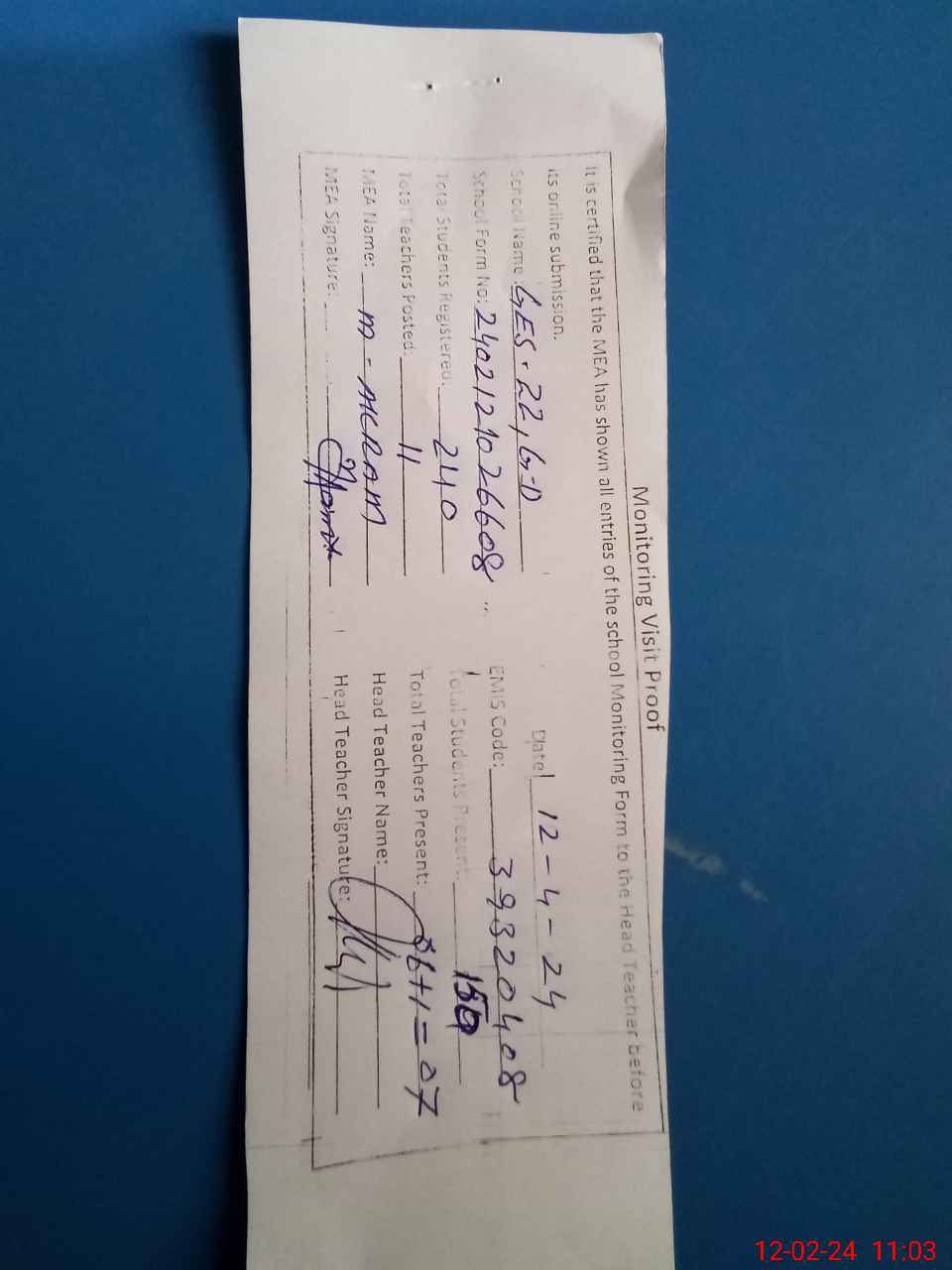 | Attendance Register | Head Teacher | MEA with School | Visit Proof |