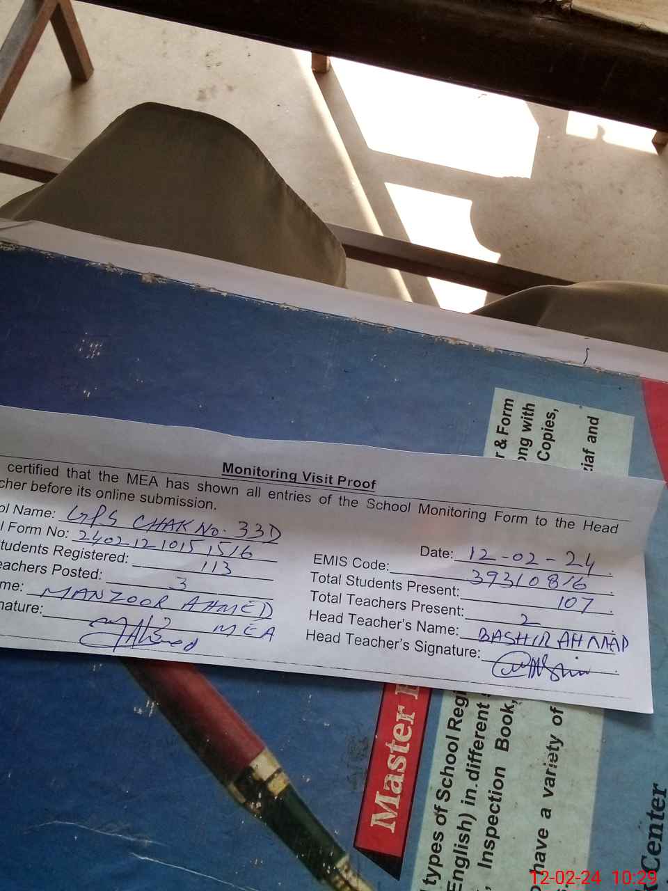 | Attendance Register | Head Teacher | MEA with School | Visit Proof |