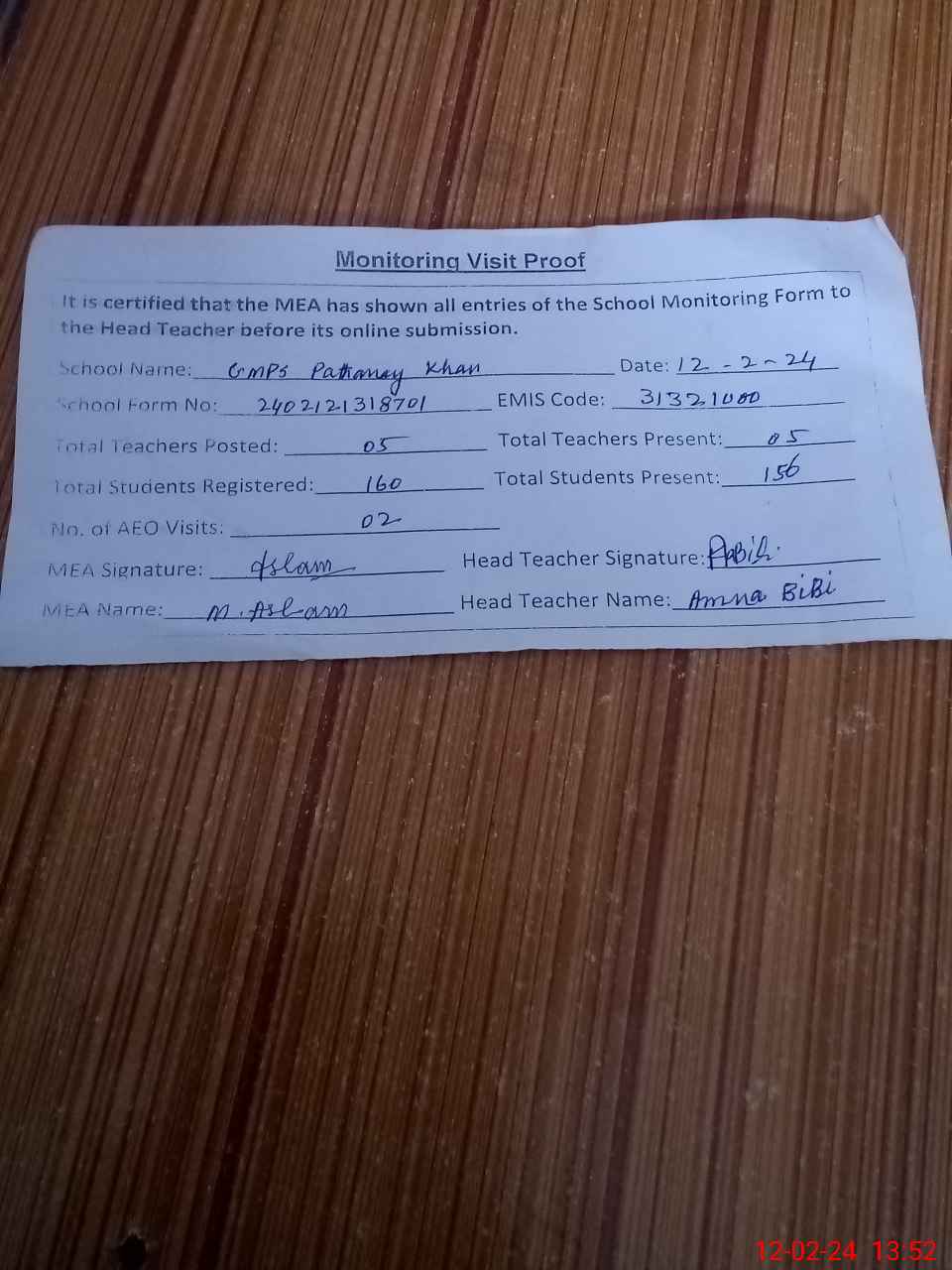 | Attendance Register | Head Teacher | MEA with School | Visit Proof |