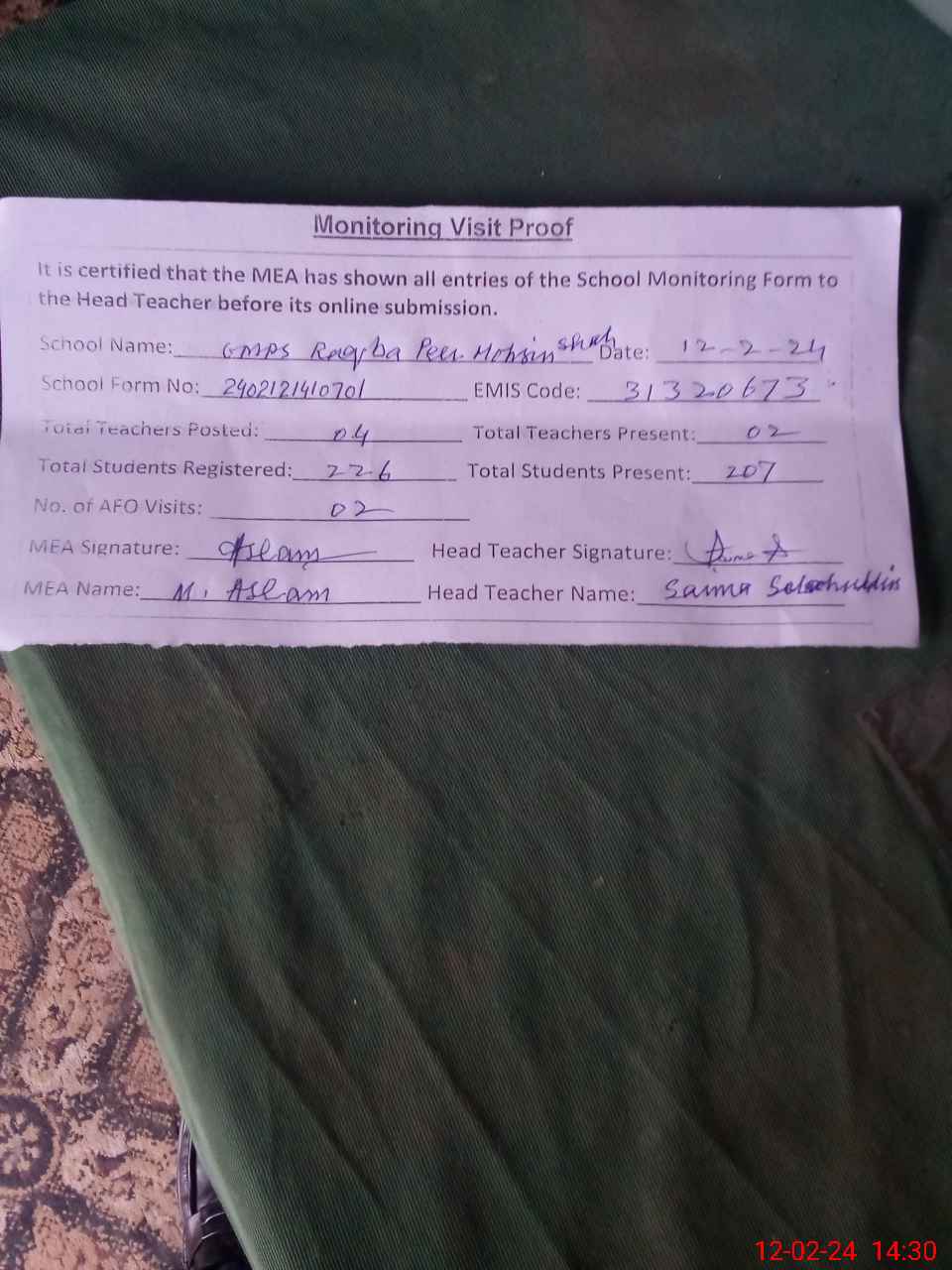 | Attendance Register | Head Teacher | MEA with School | Visit Proof |