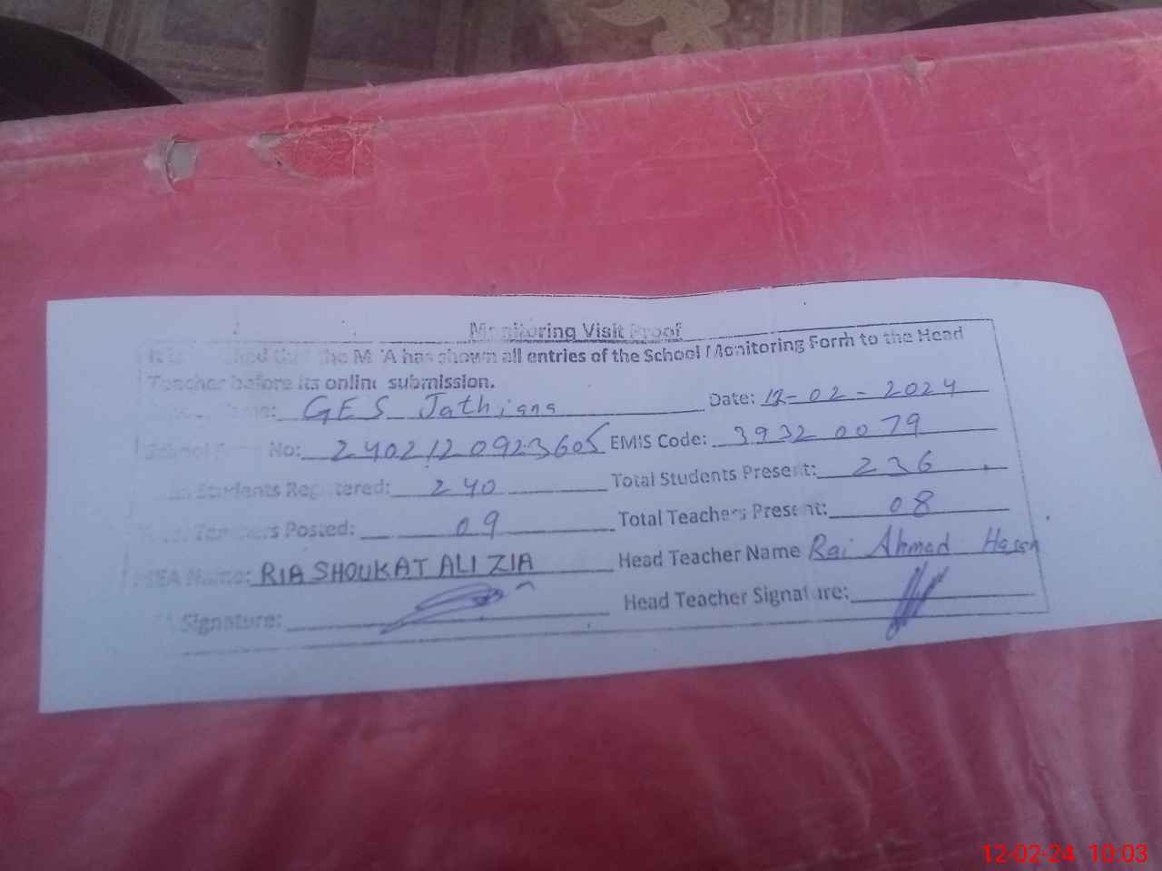 | Attendance Register | Head Teacher | MEA with School | Visit Proof |