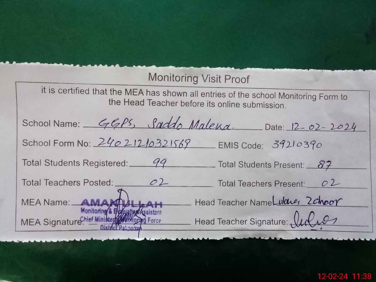 | Certified that this School was Inspected by the Undersigned MEA/DMO Today and the Information Stated Above is as Per Record. | |||||