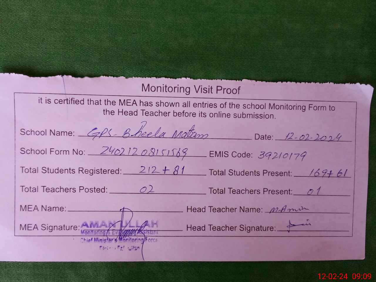 | Attendance Register | Head Teacher | MEA with School | Visit Proof |