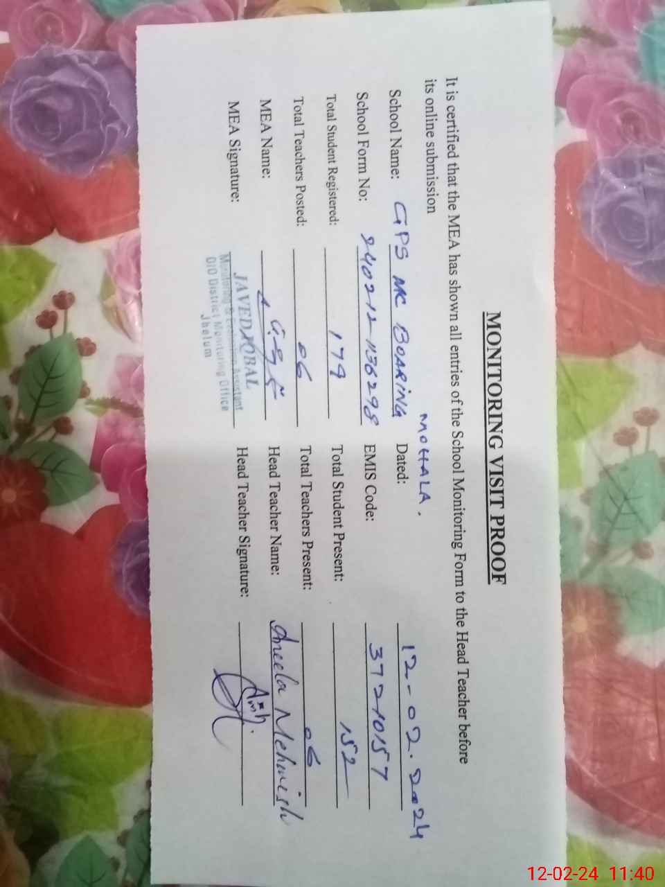 | Certified that this School was Inspected by the Undersigned MEA/DMO Today and the Information Stated Above is as Per Record. | |||||