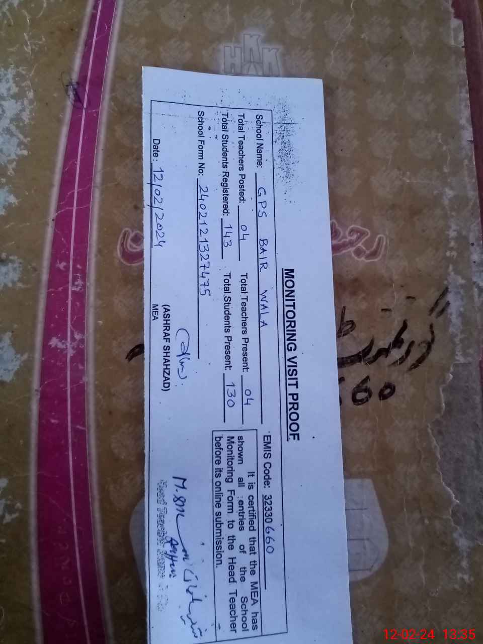 | EMIS Code: 32330660 | Name of School: GPS BAIR WALA | |||