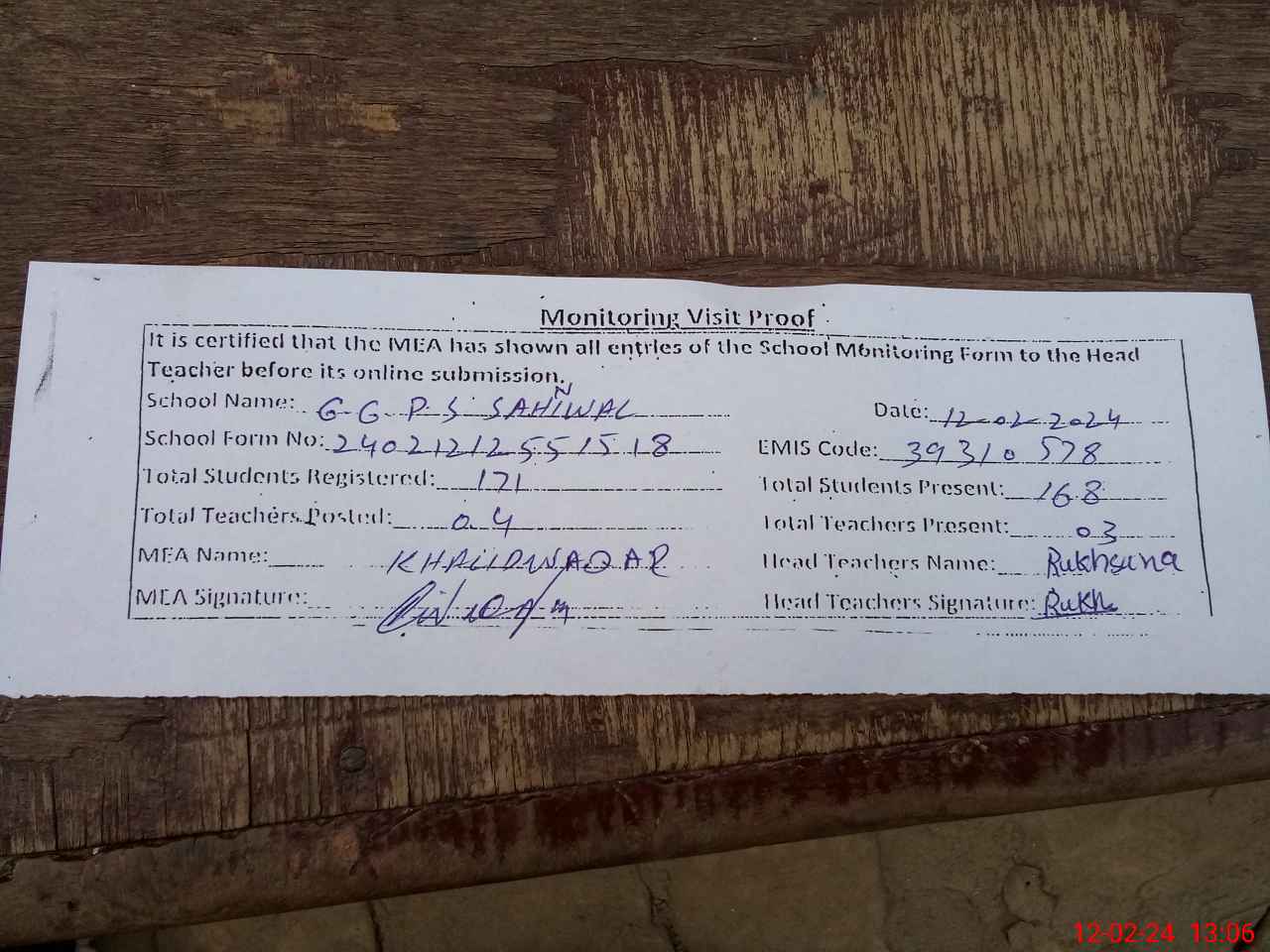 | EMIS Code: 39310578 | Name of School: GGPS SAHNI WAL | |||