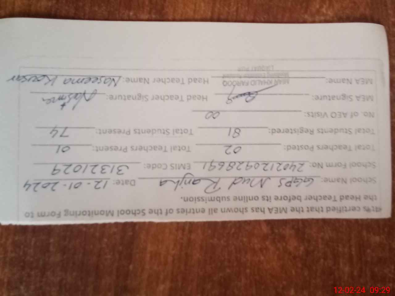 | Attendance Register | Head Teacher | MEA with School | Visit Proof |