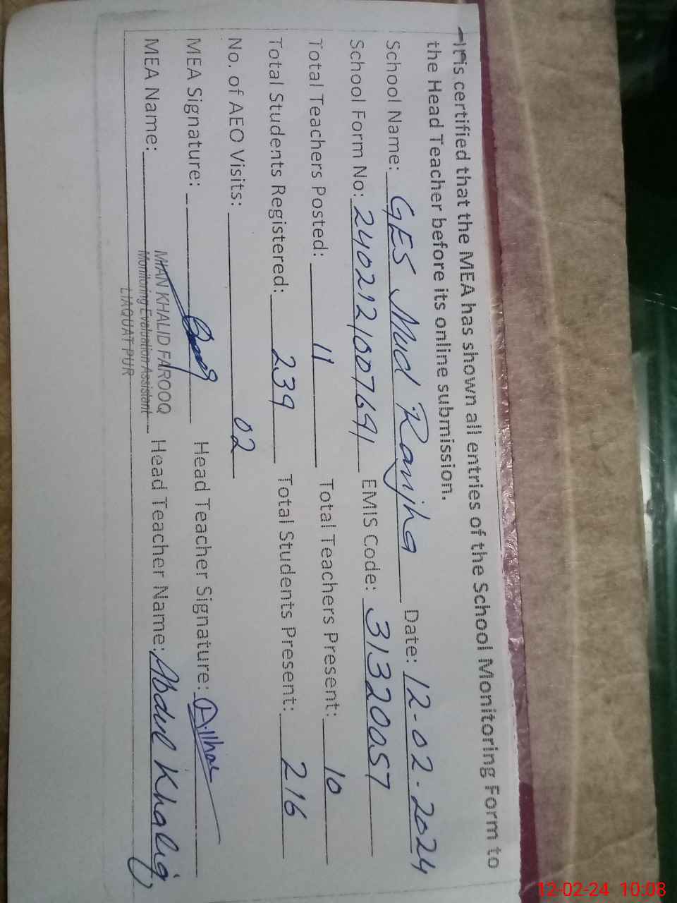 | Certified that this School was Inspected by the Undersigned MEA/DMO Today and the Information Stated Above is as Per Record. | |||||