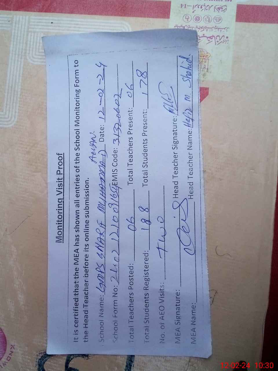 | Attendance Register | Head Teacher | MEA with School | Visit Proof |