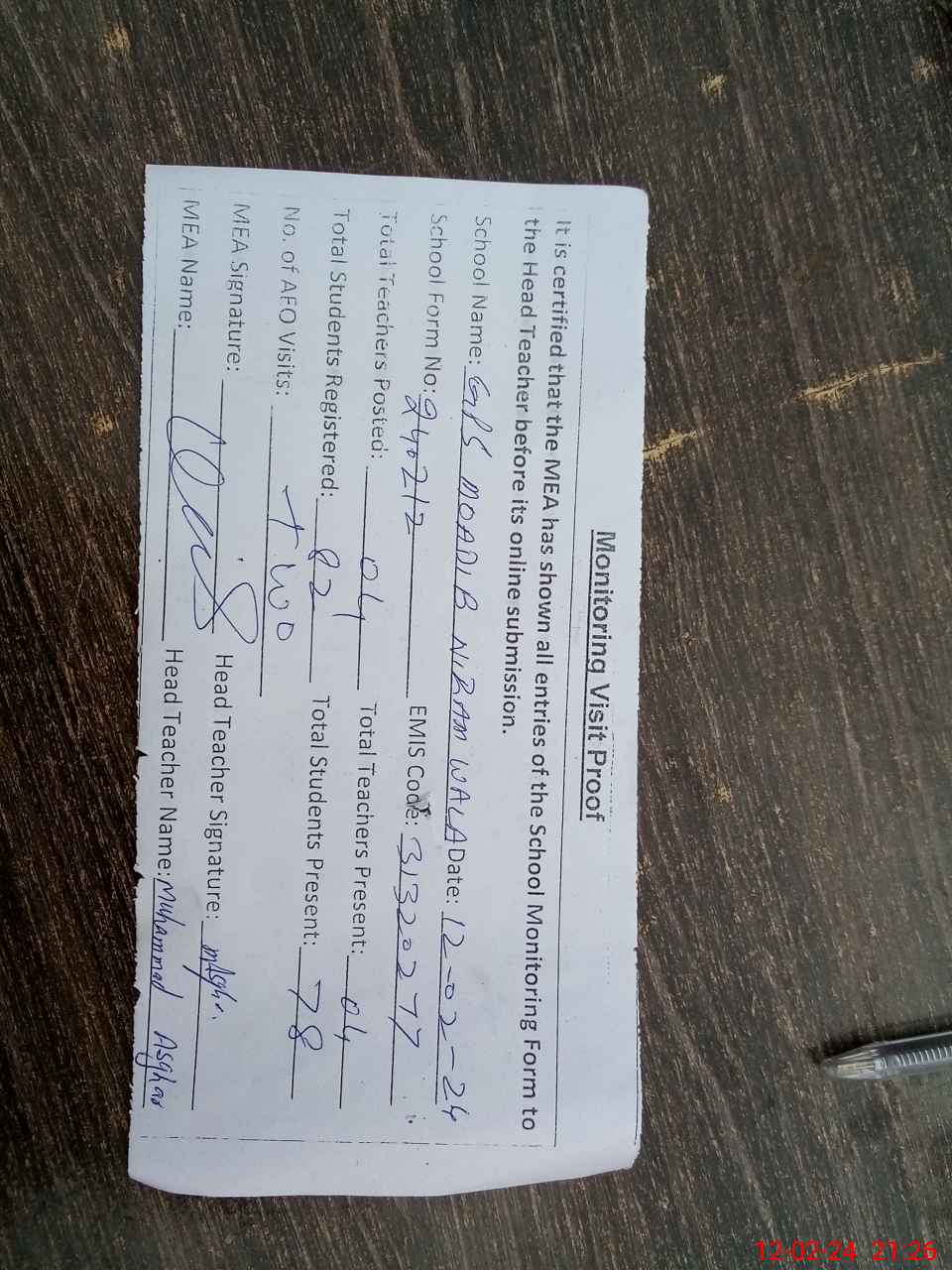 | EMIS Code: 31320277 | Name of School: GPS MOADIB NIZAM WALA | |||