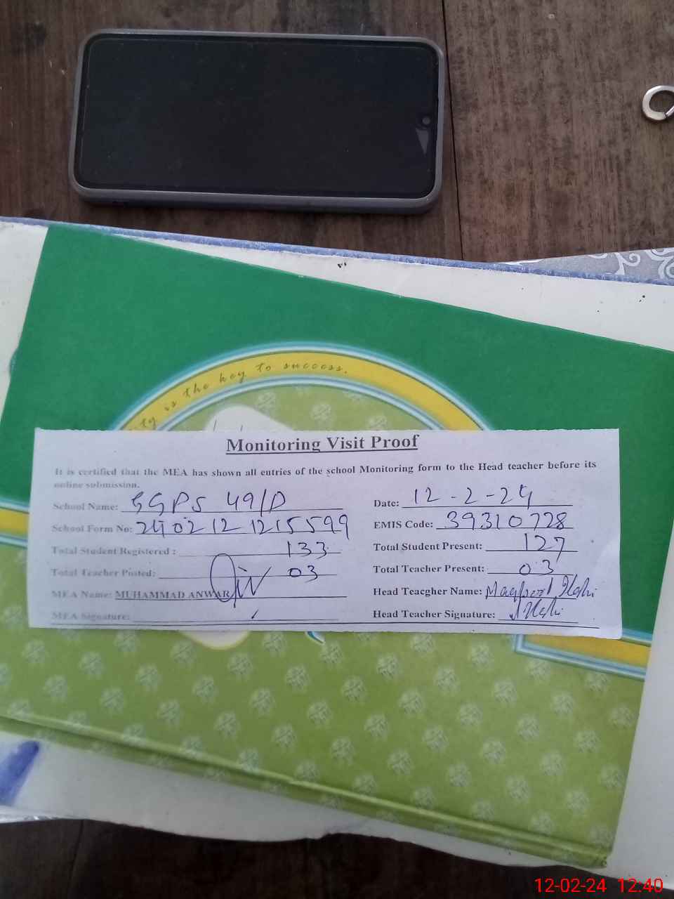 | Attendance Register | Head Teacher | MEA with School | Visit Proof |