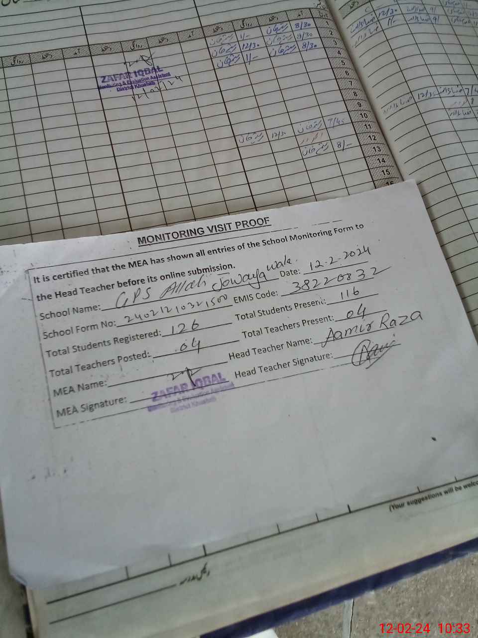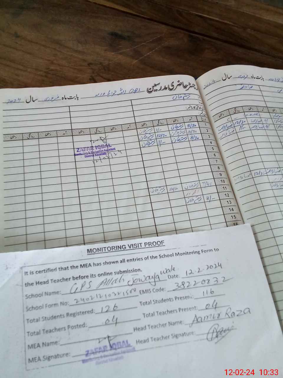 | Attendance Register | Head Teacher | MEA with School | Visit Proof |