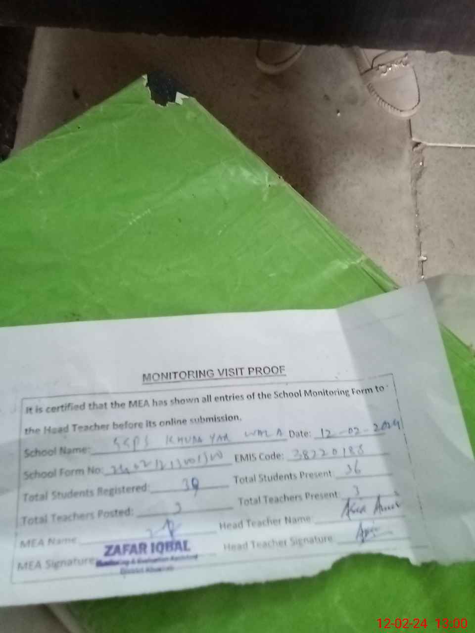 | Attendance Register | Head Teacher | MEA with School | Visit Proof |