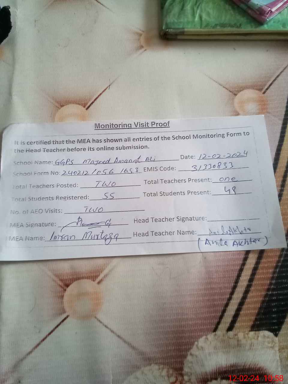 | Attendance Register | Head Teacher | MEA with School | Visit Proof |