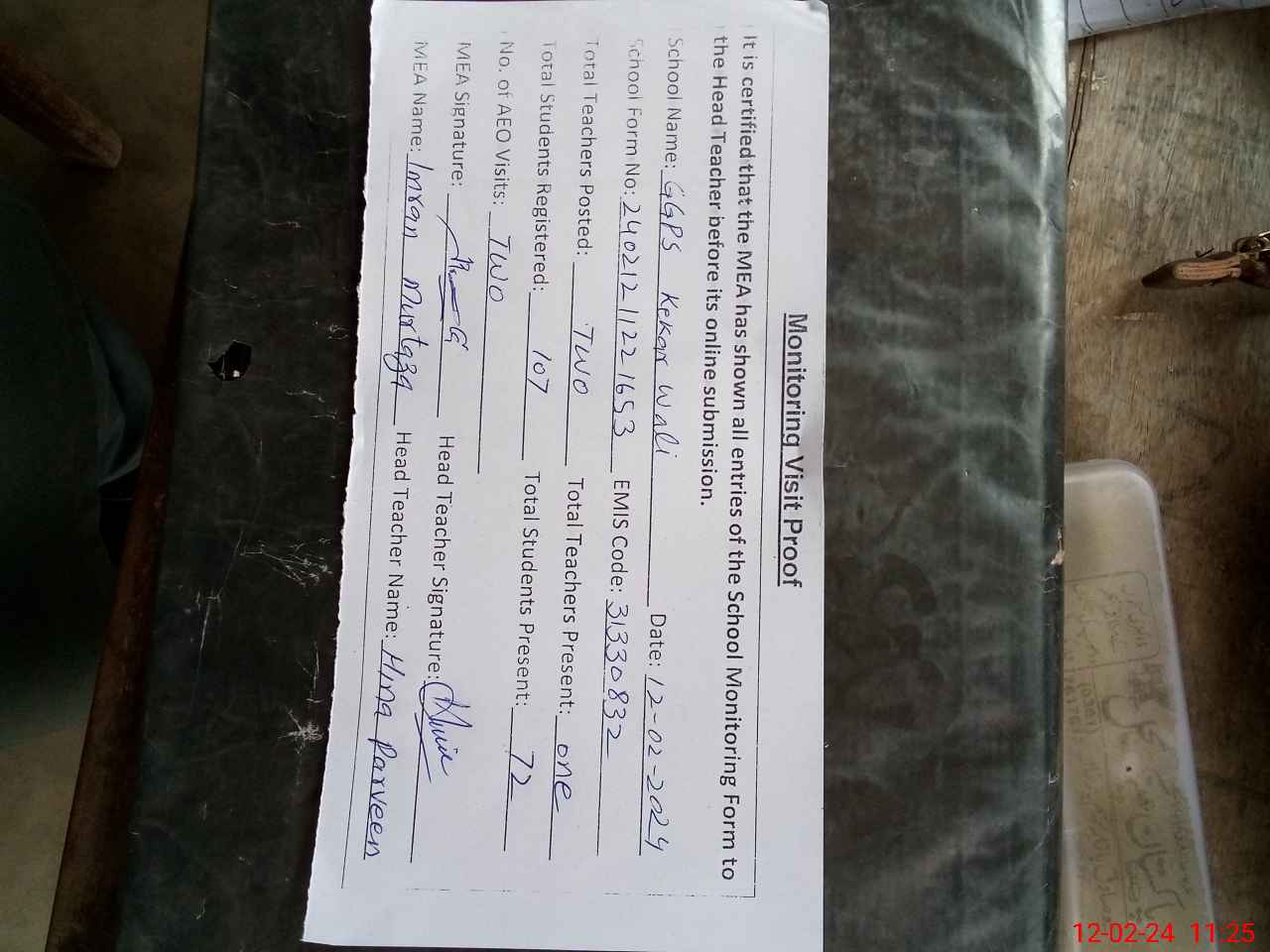 | Attendance Register | Head Teacher | MEA with School | Visit Proof |