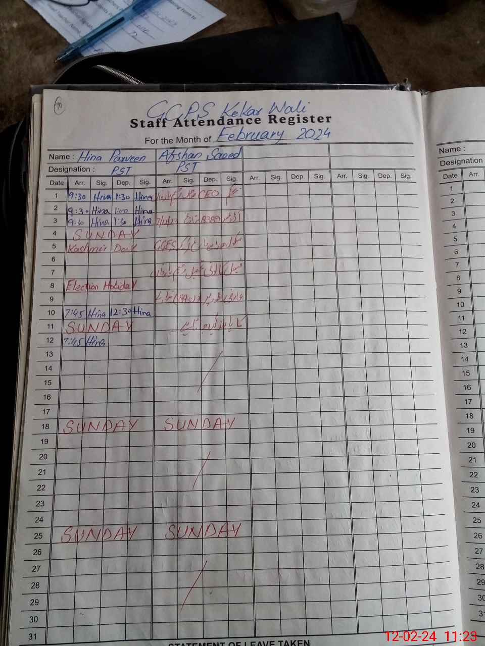 | CNIC | Full Name | Designation | R/C | Absence During Last Calender Month |