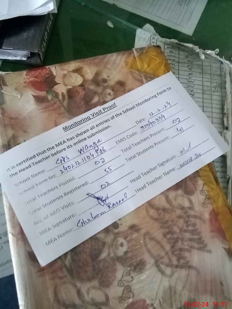 | Attendance Register | Head Teacher | MEA with School | Visit Proof |