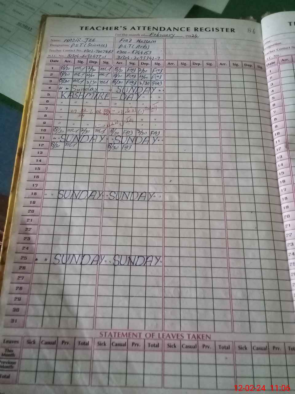 | CNIC | Full Name | Designation | R/C | Absence During Last Calender Month |