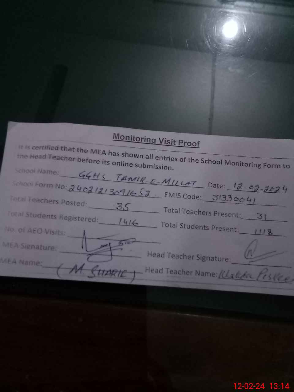 | Attendance Register | Head Teacher | MEA with School | Visit Proof |