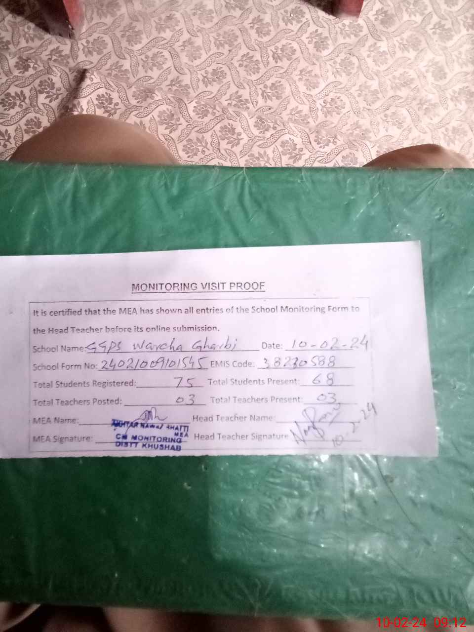 | Attendance Register | Head Teacher | MEA with School | Visit Proof |