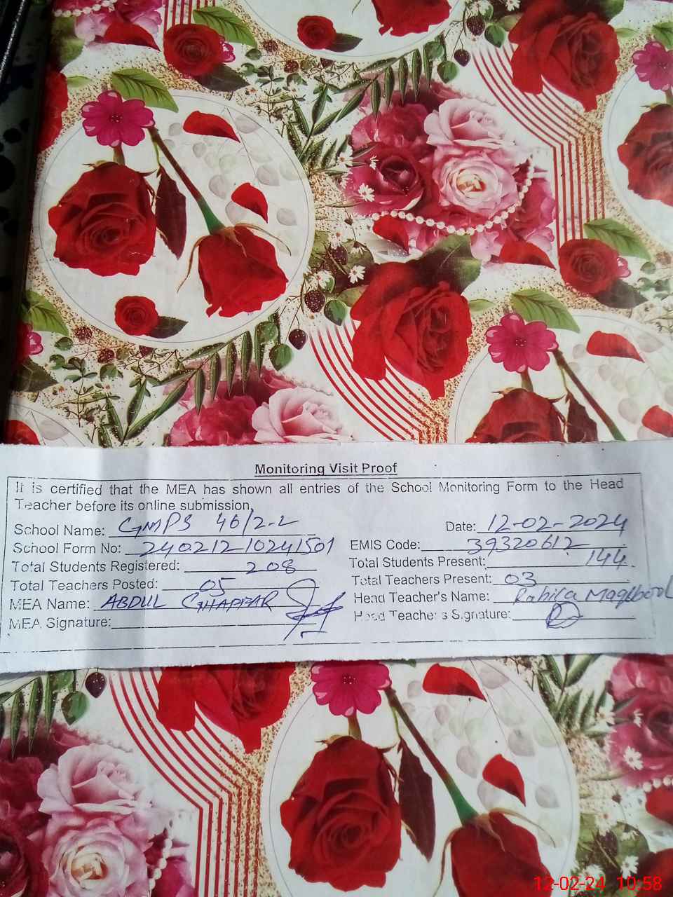 | Attendance Register | Head Teacher | MEA with School | Visit Proof |