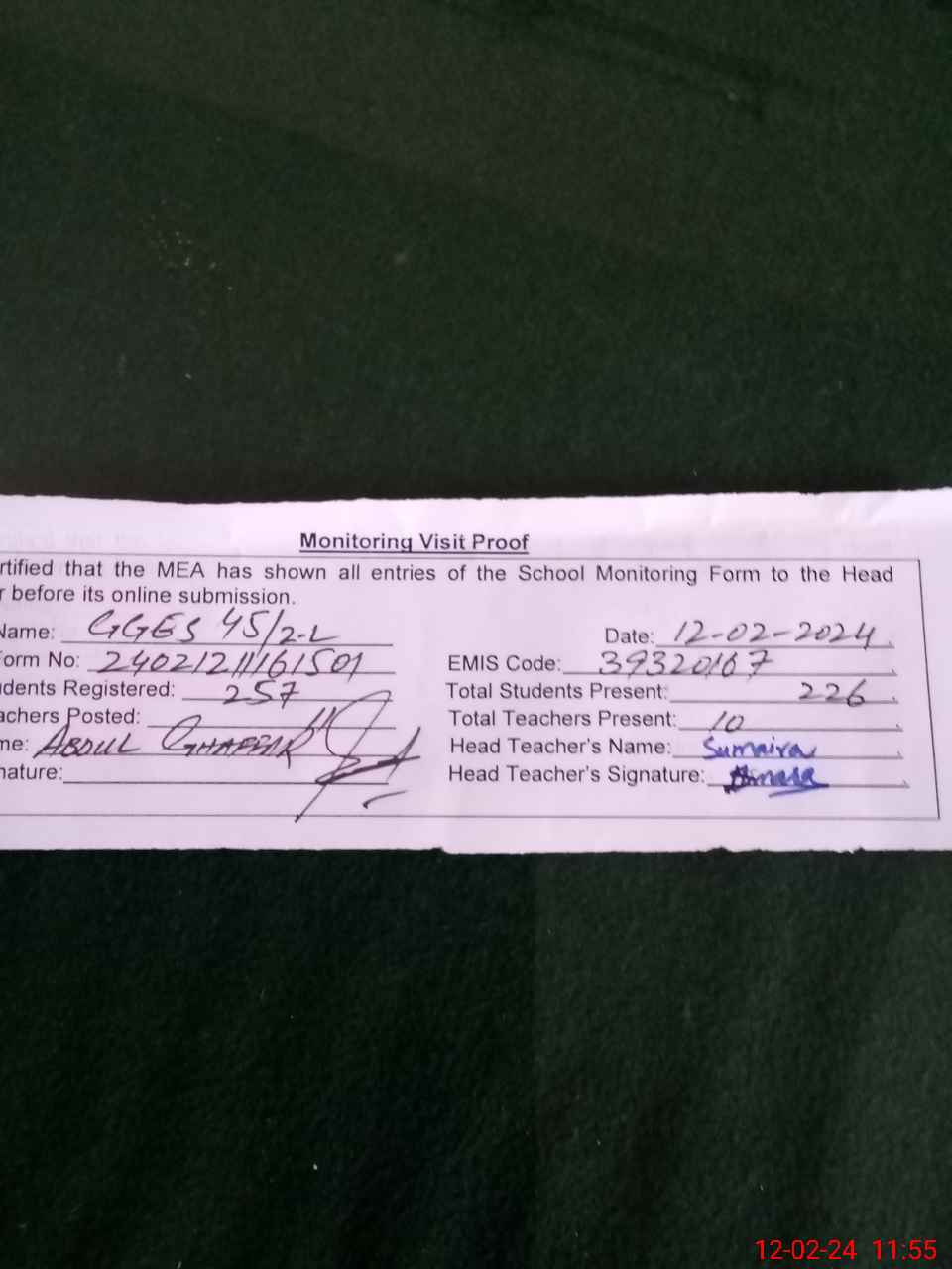 | Attendance Register | Head Teacher | MEA with School | Visit Proof |