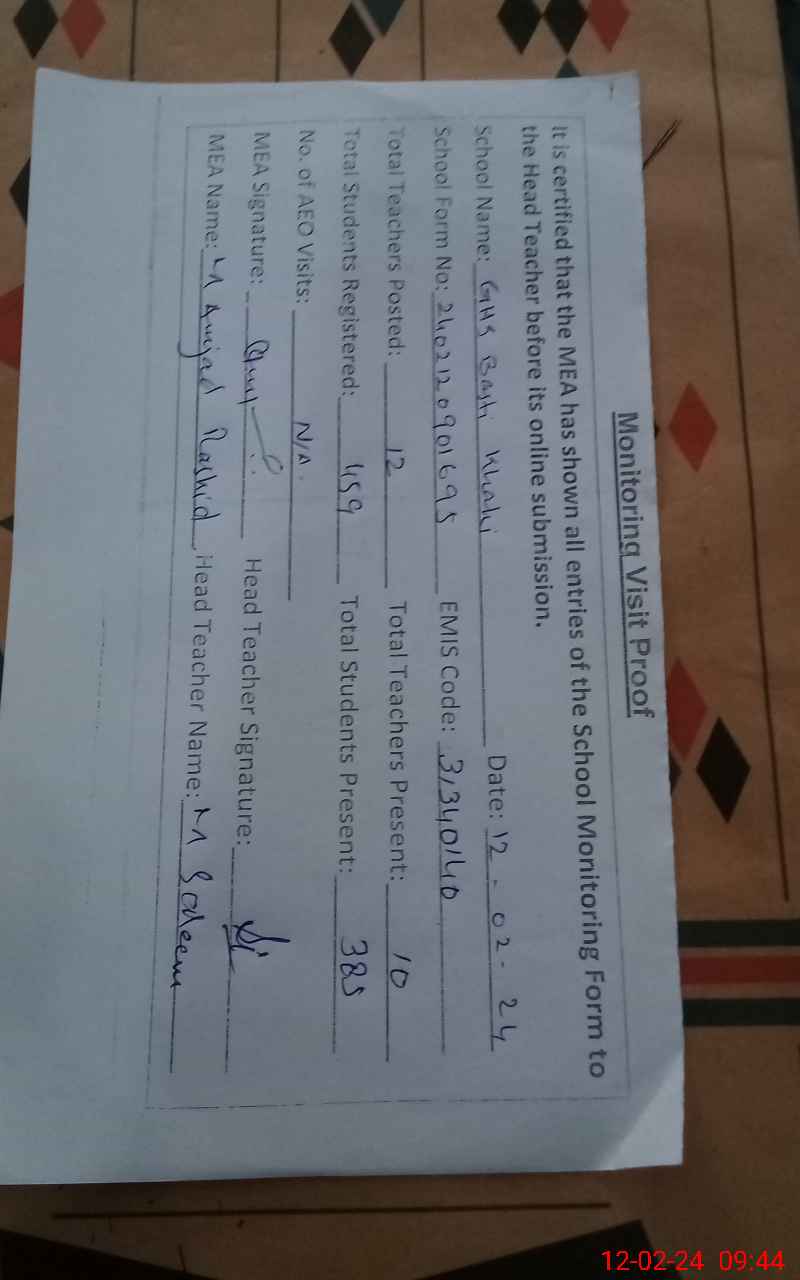 | Certified that this School was Inspected by the Undersigned MEA/DMO Today and the Information Stated Above is as Per Record. | |||||