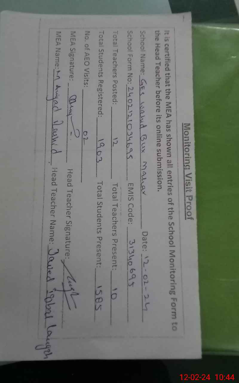 | Certified that this School was Inspected by the Undersigned MEA/DMO Today and the Information Stated Above is as Per Record. | |||||
