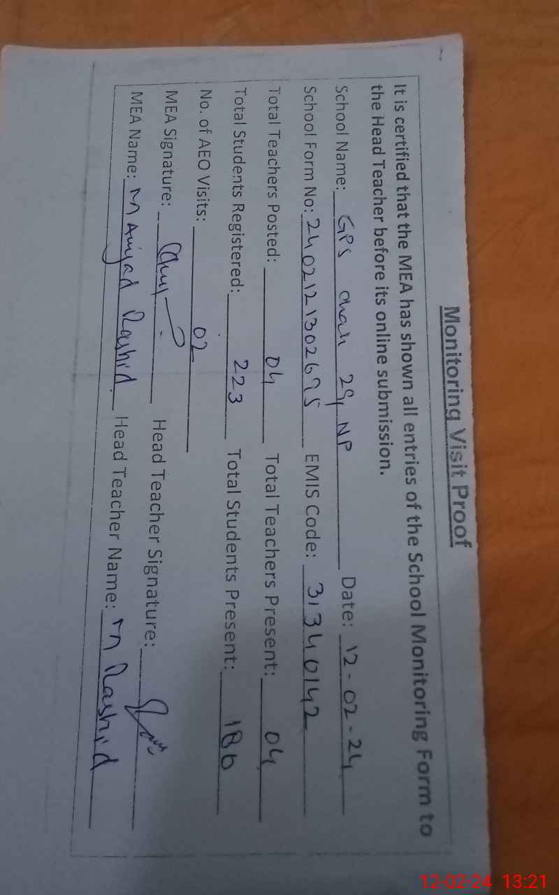 | EMIS Code: 31340142 | Name of School: GPS CHAK NO. 29/NP | |||