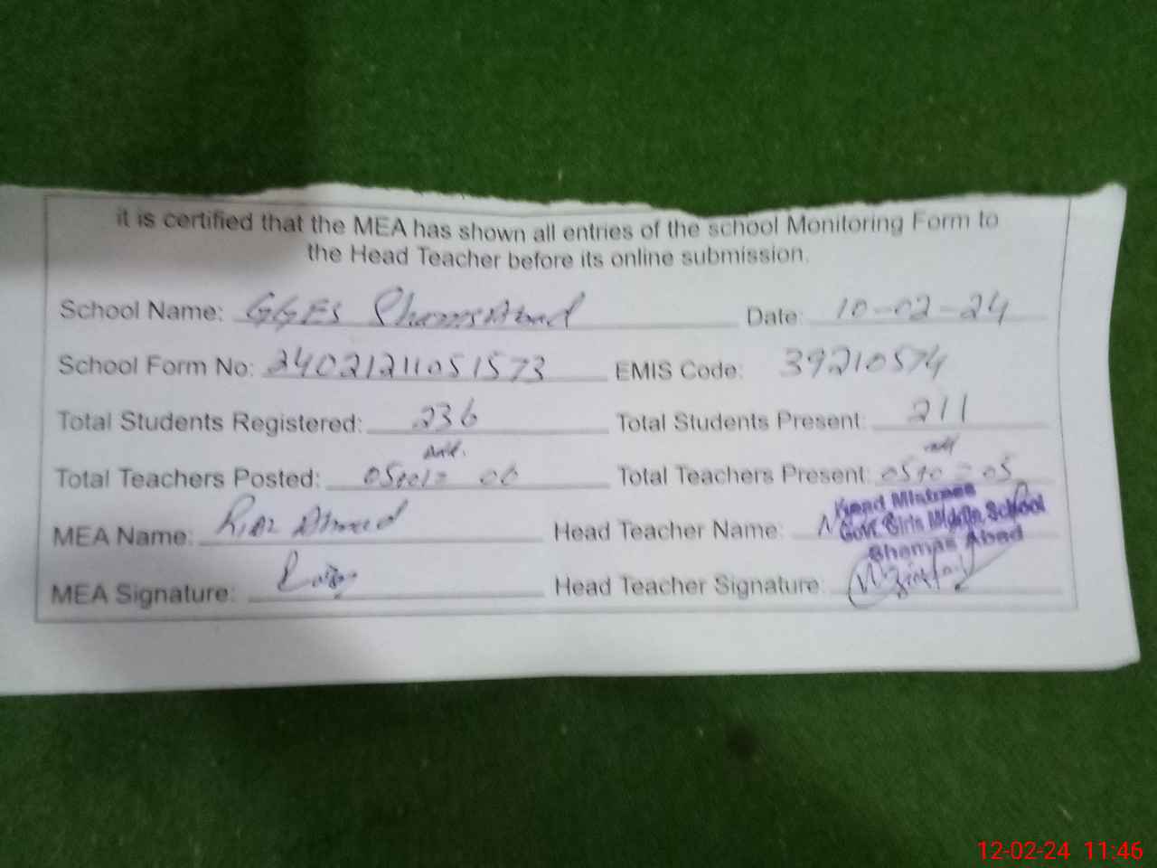 | Certified that this School was Inspected by the Undersigned MEA/DMO Today and the Information Stated Above is as Per Record. | |||||