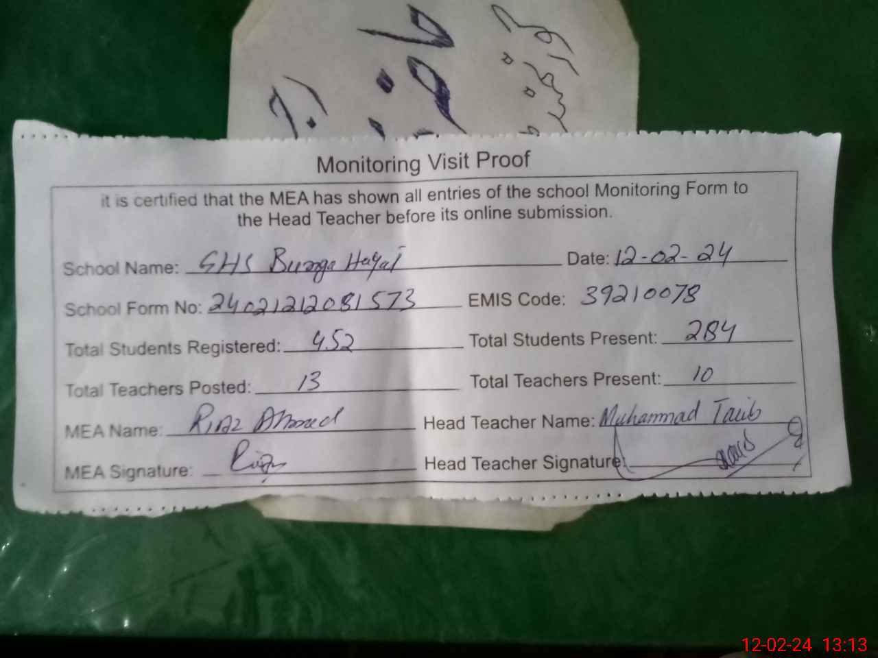 | Attendance Register | Head Teacher | MEA with School | Visit Proof |