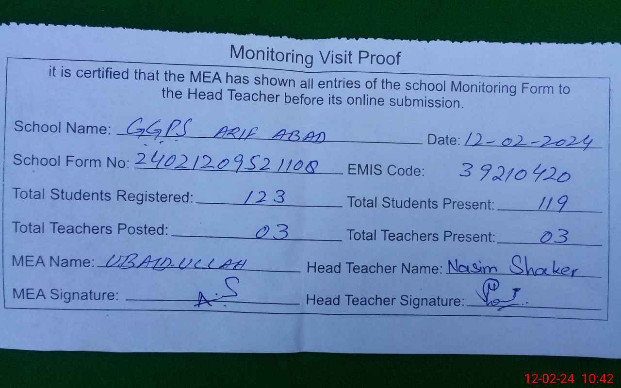 | EMIS Code: 39210420 | Name of School: GGPS ARIF ABAD | |||