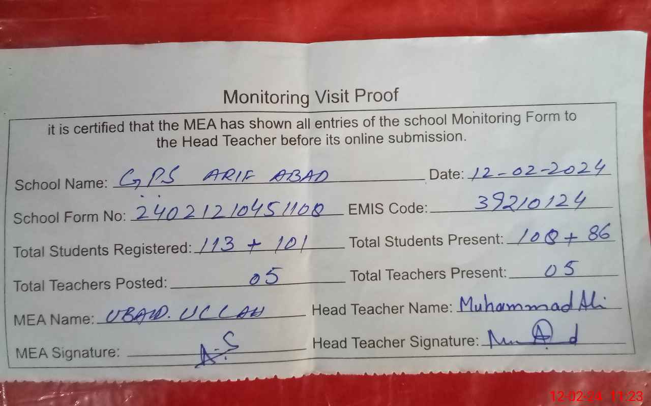 | EMIS Code: 39210124 | Name of School: GPS ARIF ABAD | |||