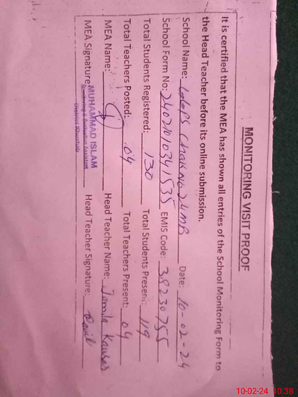 | Attendance Register | Head Teacher | MEA with School | Visit Proof |