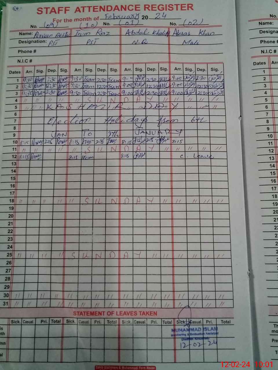 | CNIC | Full Name | Designation | R/C | Absence During Last Calender Month |