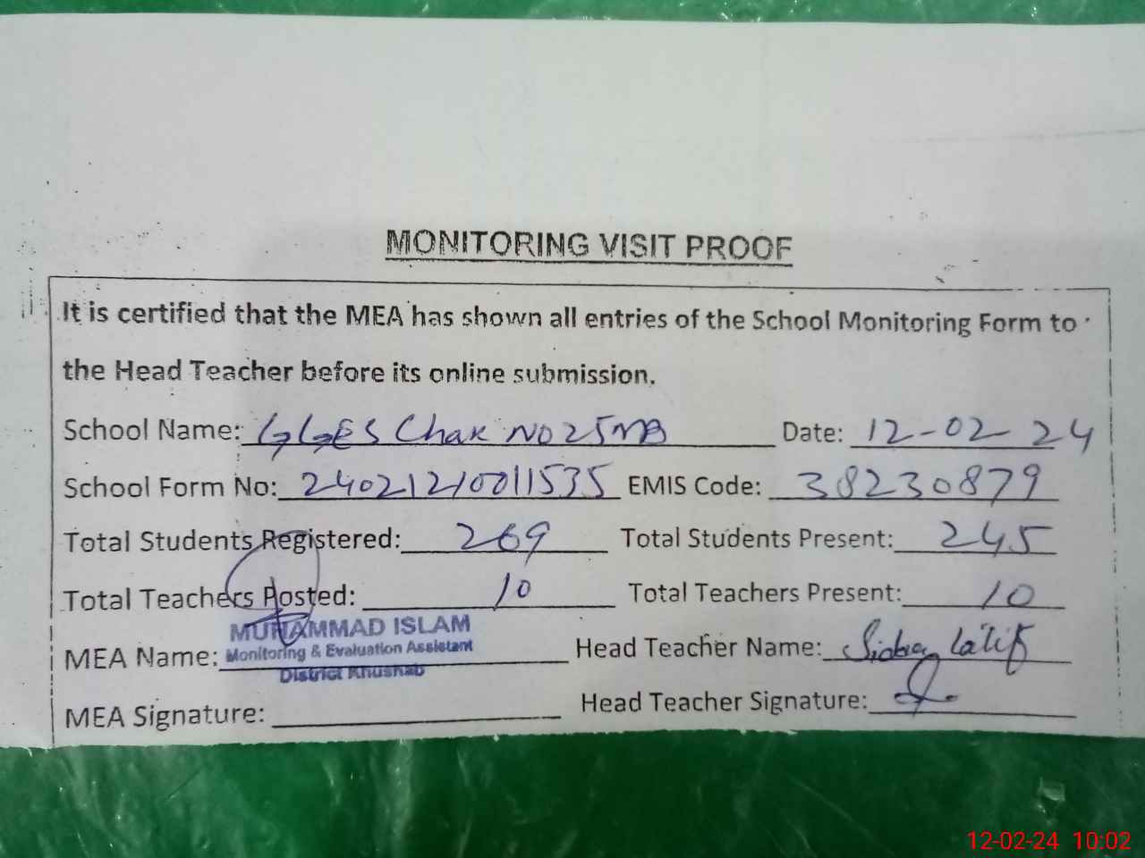 | Attendance Register | Head Teacher | MEA with School | Visit Proof |