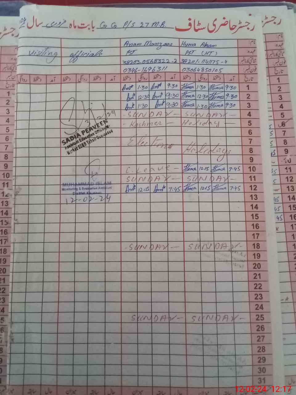 | CNIC | Full Name | Designation | R/C | Absence During Last Calender Month |
