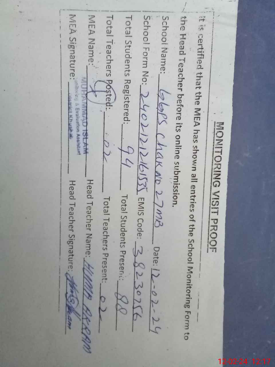 | Attendance Register | Head Teacher | MEA with School | Visit Proof |